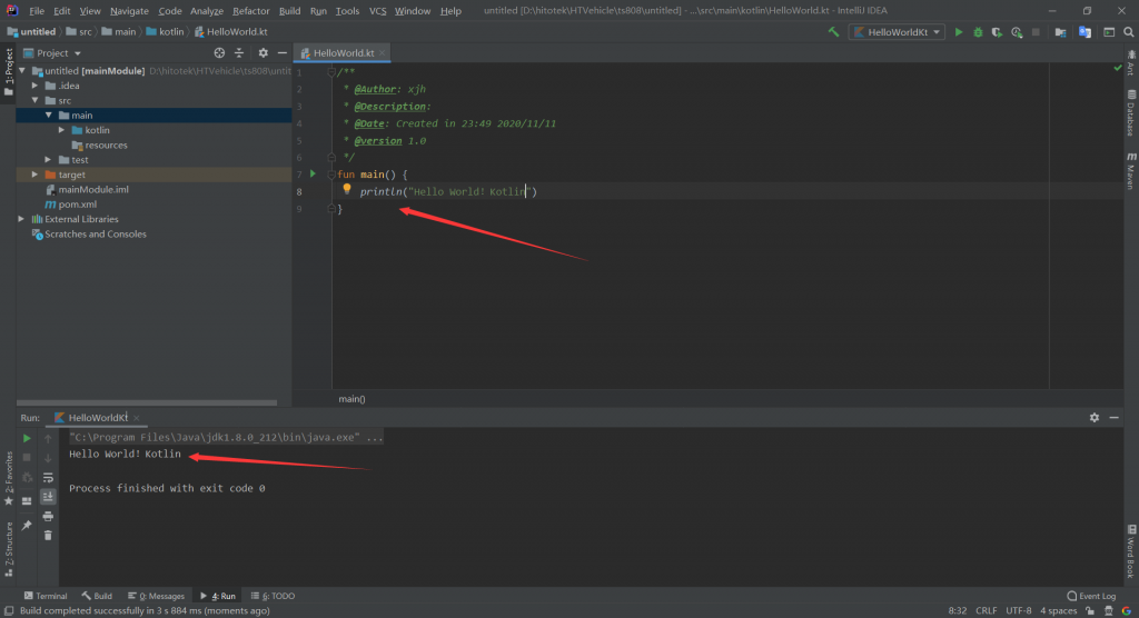 创建好后就可以写第一个程序了,让我们一起拥抱Kotlin吧!!