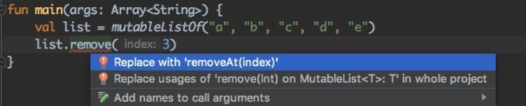 //@Deprecated注解比Java多了ReplaceWith功能, 这样当你在调用remove方法,编译器会报错。使用代码提示会自动IntelliJ IDEA不仅会提示使用哪个函数提示替代它,而且会快速自动修正。
