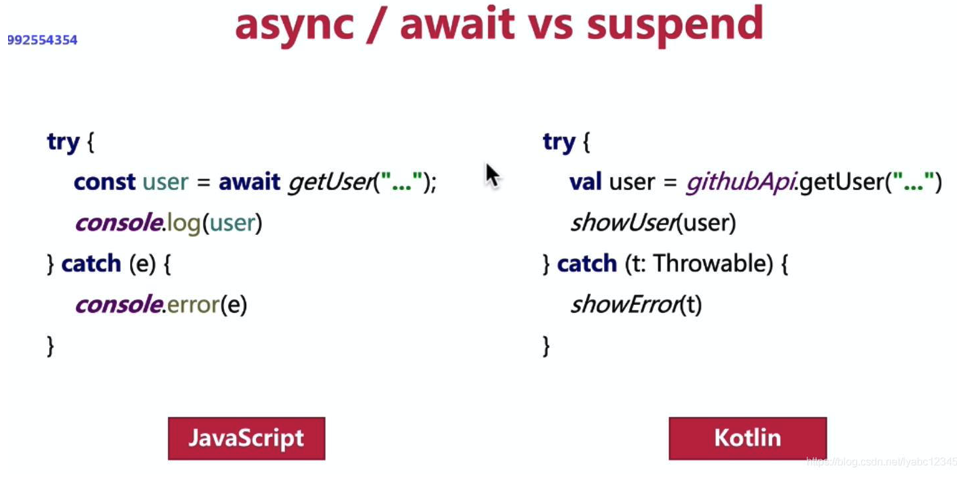 js需要在使用的时候添加这俩关键字,kotlin就比较优秀了,使用的时候感觉不出来,就像完全的同步代码一样,只不过它是定义的时候写好了罢了。